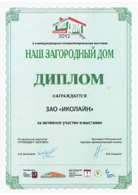На прошедшей недавно в Москве 2-й международной специализированной выставке "Наш загородный дом", компания ЗАО "ИКОЛАЙН", производящая инфракрасные обогреватели ИкоЛайн была награждена дипломом за активное участие в выставке.